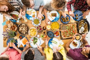 Het sociale aspect van eten is erg belangrijk voor de gezondheid. Gemeenschappelijke maaltijden zijn ontspannen en gezellig. Volwassenen moeten de kinderen erbij betrekken, hen leren om verstandige keuzes te maken binnen het mediterrane kader en hen laten zien hoe ze moeten koken en salades snijden. De Israëlische levensstijl gaat gepaard met grote Shabbat maaltijden op vrijdagavond die zelfs in de minst religieuze Joodse gezinnen “heilig”zijn, en het spreekt voor zich dat maaltijden tijdens Pesach , Rosh Hashana en de Yom Ha’atzmaut barbecues vereisen vaak dat gastheren extra klapstoelen moeten lenen om alle gasten te ontvangen. Ook Arabische Israëli’s staan erom bekend dat ze rijke gemeenschappelijke maaltijden serveren aan familie en vrienden.