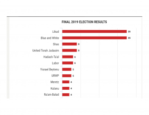 Likud en Blue & White hebben ieder 35 zetels , Shas en United Torah Judaism ieder 8 zetels, Ha’adash Taal en Labor ieder 6 zetels, Ysrael Beteynu en URWP ieder 5 zetels, Meretz, Kulanu en Arabische Ra’am Balad ieder 4 zetels.