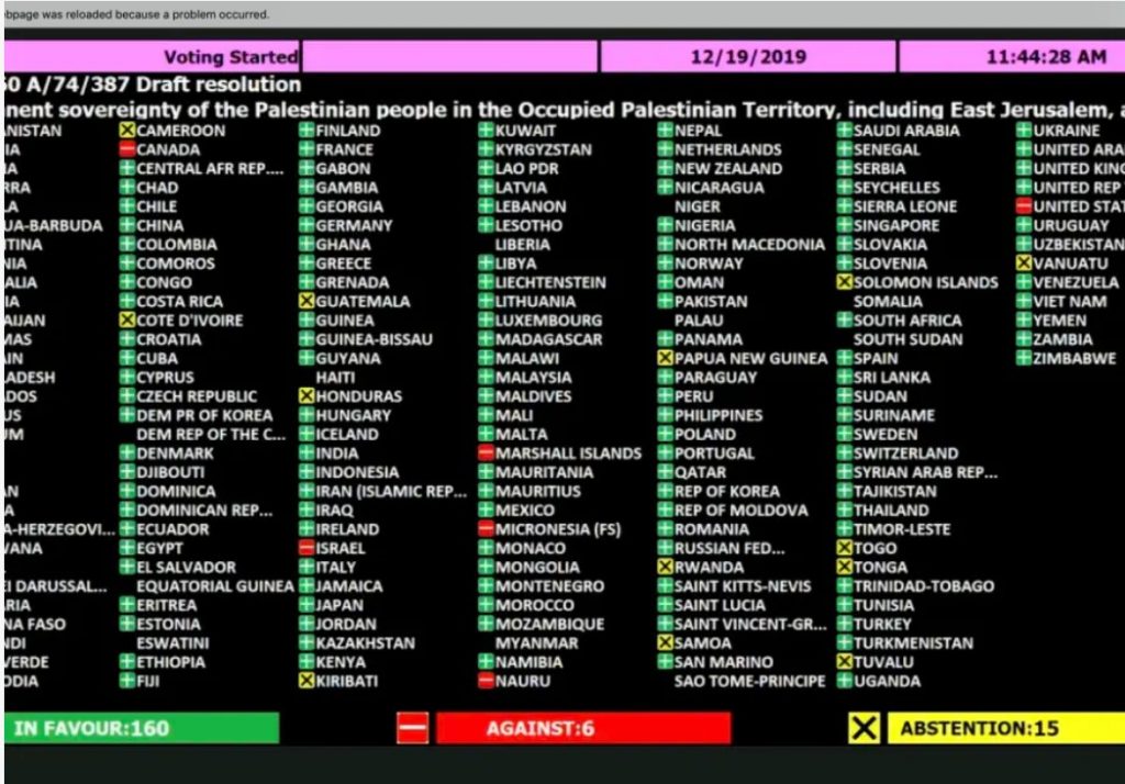 De algemene vergadering van de Verenigde Naties keurde met 160 stemmen voor en 6 tegen, met 15 onthoudingen, een jaarlijkse resolutie goed genaamd “Permanente soevereiniteit van het Palestijnse volk en van de Arabische bevolking in het bezette Palestijnse gebied, inclusief Oost-Jeruzalem en in de bezette Syrische Golan over hun natuurlijke hulpbronnen.”