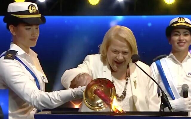 Israël krijgt niet genoeg van de 92 jarige over-over grootmoeder Renee Abitbul uit Jeruzalem die tijdens de fakkel ceremonie aan het begin van Onafhankelijkheidsdag, dinsdag, met een brede trotse glimlach een van de fakkels ontstak.