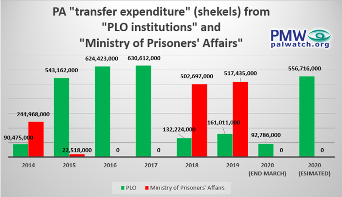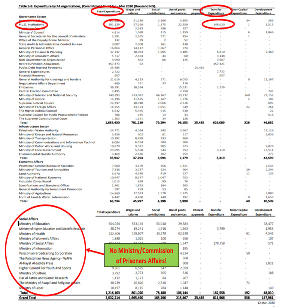 Uit een gedetailleerde analyse van de begrotingsprestatierapporten van de PA blijkt dat de PA in 2018 736 miljoen shekel (€194 euro) heeft uitgegeven aan de financiering van het ministerie van Gevangenen. Het jaar daarop besteedde de Autoriteit 619 miljoen shekel voor de financiering van de Commissie voor aangelegenheden van gedetineerden. Ruim 500 miljoen shekel werd besteed aan de salarissen van terroristen.
