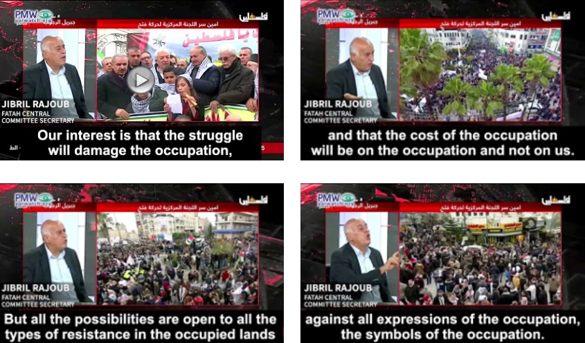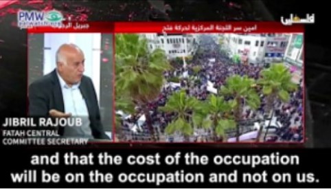 Fatah-secretaris van het Centraal Comité, Jibril Rajoub: “Ons belang is dat de strijd de bezetting zal schaden en dat de kosten van de bezetting bij de bezetting komen te liggen en niet bij ons. Maar alle mogelijkheden staan open voor alle soorten verzet in de bezette landen tegen alle uitingen van de bezetting, de symbolen van de bezetting.” [Officiële PA-tv, 17 augustus 2020]