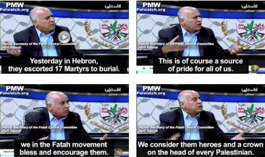Fatah Secretaris van het Centraal Comité Jibril Rajoub: “Deze maand zag de dood als martelaar van de geestelijk vader van de nationale situatie in de bezette gebieden in zijn tijd, broer ‘ Abu Jihad ‘ (dwz terrorist, geplande moord op 125) – onze Prins van Martelaren… [Deze maand] zag ook de ontvoering van de nationale commandant, broeder Marwan Barghouti (dwz terrorist, plande 3 aanslagen, 5 vermoord) … Broeder Marwan is een nationale commandant voor ons en een [Fatah] lid van het Centraal Comité met veel van zijn broers: Karim Younes, die ook lid is van het Centraal Comité, broer Maher Younes (dwz terroristen, vermoord 1), broer Diya Al-Agha (dwz terrorist, vermoord 1), broerAbu Shadi [Muhammad] Al-Tous (dwz terrorist, betrokken bij de moord op 9), en 26 anderen … Deze maand en deze dag zijn we toegewijd en loyaal aan hun pad, aan hun offer, Martelaren of gevangenen … Ieder van hen [verrichtte] glorieuze daden . [Officiële PA-tv, persoonlijke ontmoeting, 16 en 17 april 2020]