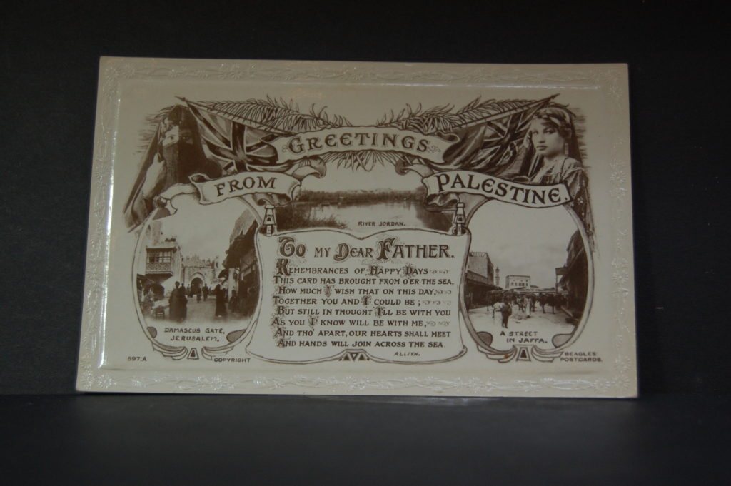 Ook zijn er veel ansichtkaarten die werden verstuurd door Britse soldaten die in het toenmalige Engelse mandaatgebied waren gelegerd.