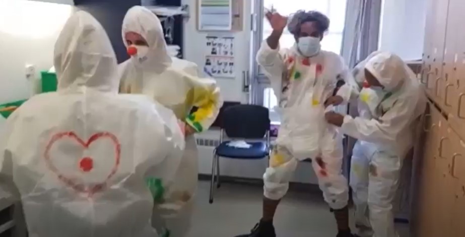 Zoals de onderstaande video laat zien, versieren Hadassah’s Dream Doctors hun PBM met stickers en wikkelen ze een luier voor volwassenen om hun overall om er extra belachelijk en niet-bedreigend uit te zien. Onder de overalls met omslagen gluren waanzinnig luide sokken en clown schoenen in wegwerphoezen.