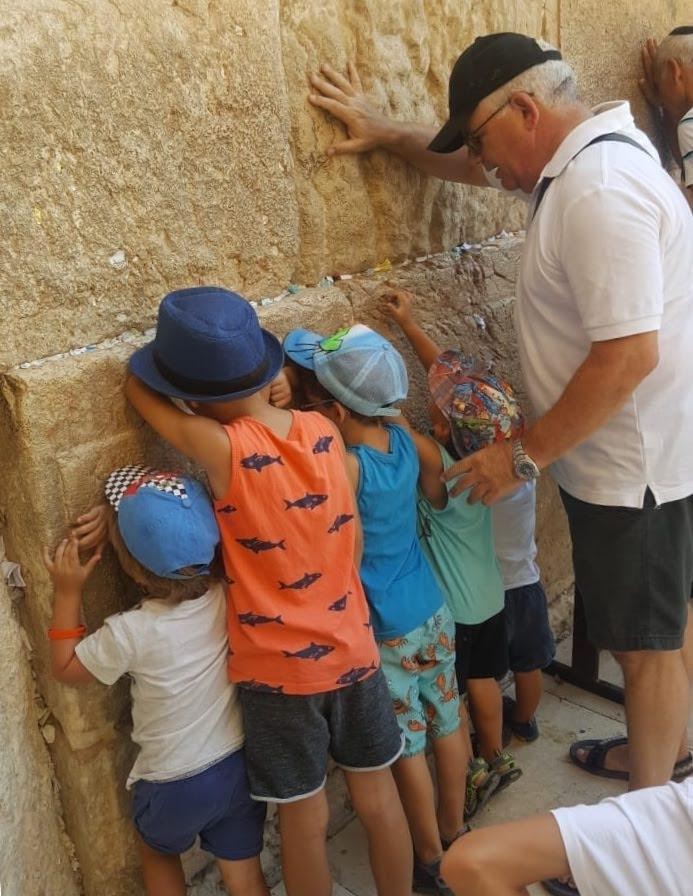 Terug naar Jeruzalem, ga ik graag naar de Klaagmuur. Gebouwd volgens de VN in 1967. Ooit ging ik daarheen met vrouw en drie kinderen. Nu komen we met de hele bups: alle 7 kleinkinderen en met de vijf oudsten heb ik al een routine, hoe we bij de Klaagmuur even een moment hebben voor onze gedachten tegenover de Almachtige: