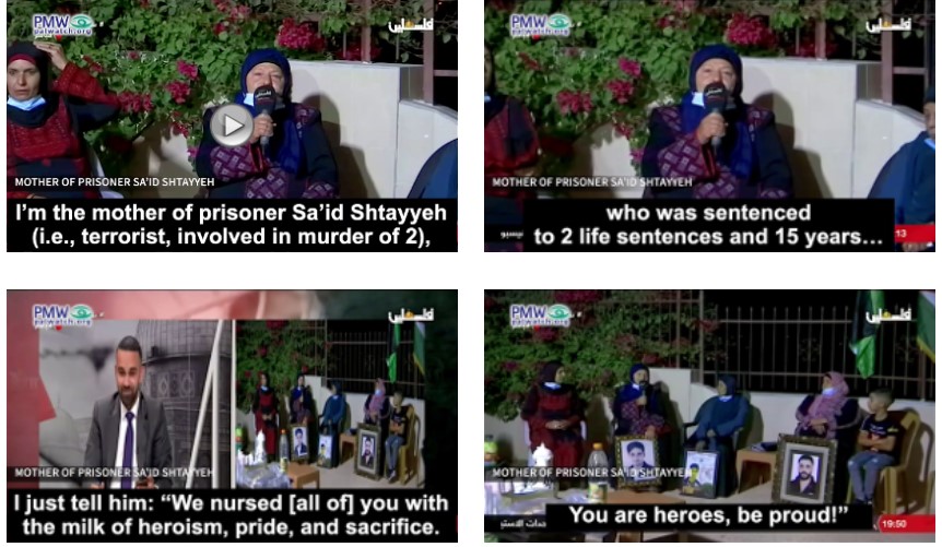 Moeder van gevangene Sa’id Shtayyeh: “Ik ben de moeder van gevangene Sa’id Shtayyeh (dwz terrorist, betrokken bij moord op 2 Israëlis), die veroordeeld werd tot 2 levenslange gevangenisstraffen en 15 jaar … Ik zeg hem gewoon: verzorgde u allen met de melk van heldendom, trots en opoffering. Jullie zijn helden, wees trots! “ [Officiële PA-tv, Giants of Endurance , 15 oktober 2020]