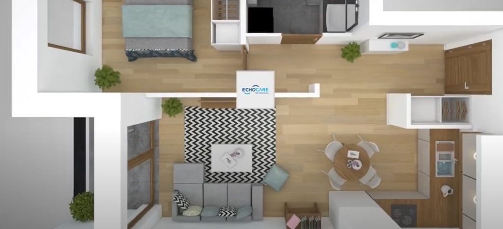 Omdat de radar door muren heen kijkt, kan één ECHO-eenheid die aan het plafond of de muur is geïnstalleerd, één persoon (of twee personen in een toekomstige versie) monitoren in een standaard appartement in een seniorenwoning.