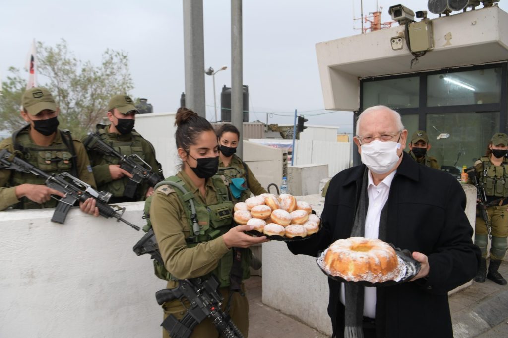 Onderweg stopte de president bij de wegversperring bij Metzukei Dragot op de weg naar de Dode Zee en deelde Sufganiyot en de sinaasappeltaart uit die zijn overleden vrouw Nechama gebruikelijk was om te bakken tijdens Chanoeka.