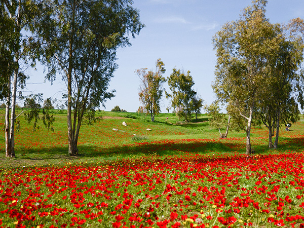 Het lenteseizoen in Israël, van februari tot april, bedekt veel velden met wilde bloemen, afhankelijk van regenval en hoogte. De beschermde kroonanemonen, genoemd naar hun zwarte centrum, diep rode kleur en ronde vorm, maken de meestal kale vlaktes van de noordelijke Negev schitterend rood.