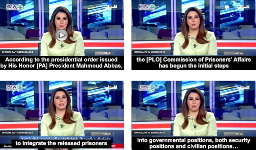 Officiële PA TV-nieuwslezer: “Volgens het presidentiële bevel uitgevaardigd door His Honor [PA] President Mahmoud Abbas, is de [PLO] Commission of Prisoners ‘Affairs begonnen met de eerste stappen om de vrijgelaten gevangenen te integreren in overheidsfuncties, zowel veiligheidsfuncties als civiele functies. posities … ” Abu Bakr: “Na het besluit van Zijne Exellentie, de president, is de integratie van de gevangenen begonnen, zowel in de militaire sector als in de civiele sector … Elke gevangene zal een formulier invullen met de benodigde informatie en vragen wat hij wil, of het nu in de veiligheid of civiel kader. “