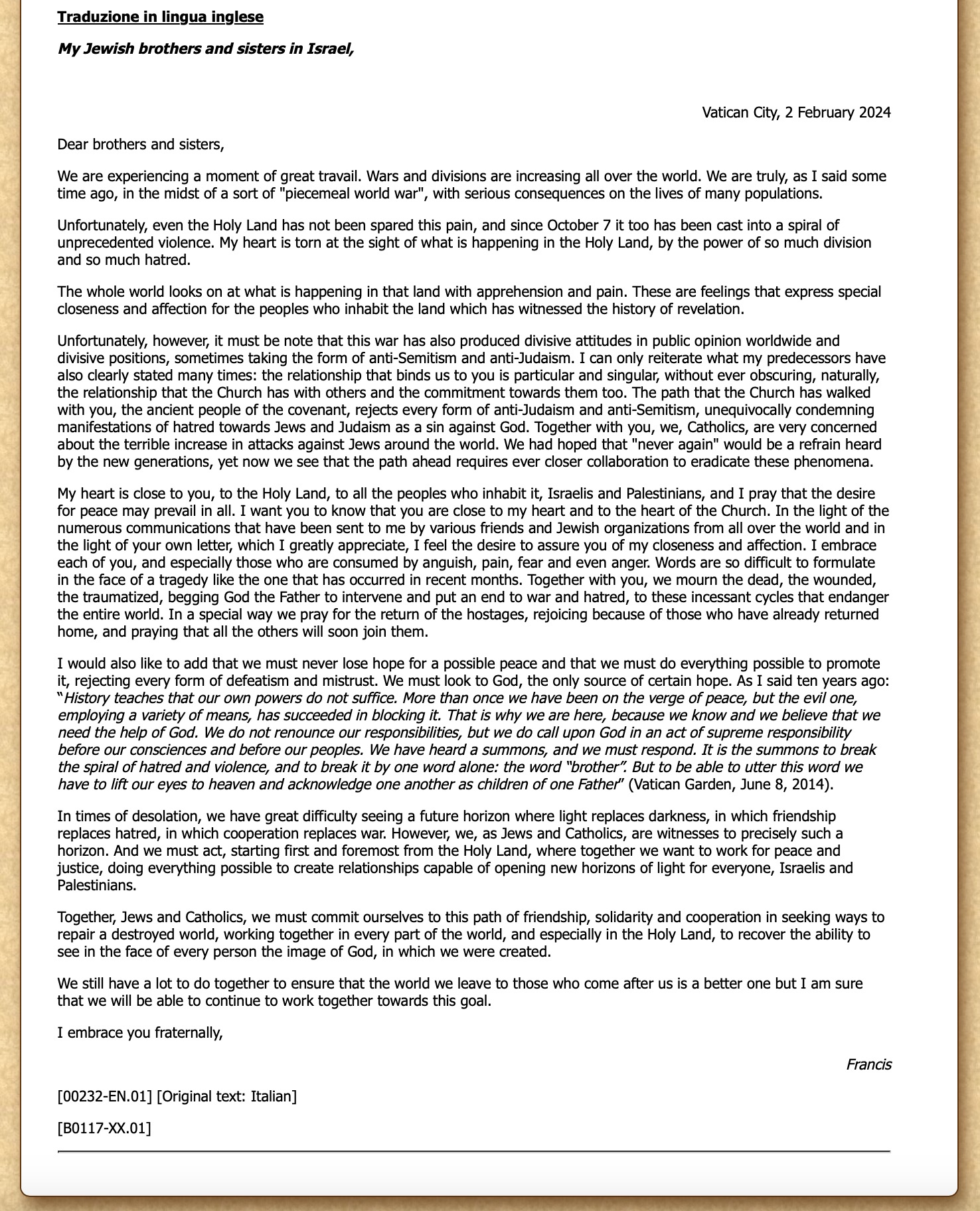 In het licht van de talrijke communicaties die mij zijn gestuurd door verschillende vrienden en Joodse organisaties van over de hele wereld, en in het licht van jullie eigen brief, die ik zeer waardeer, voel ik de behoefte om jullie mijn nabijheid en genegenheid te verzekeren. Ik omhels elk van jullie, en vooral degenen die verteerd worden door angst, pijn, vrees en zelfs boosheid. Woorden zijn zo moeilijk te formuleren in het gezicht van een tragedie zoals die zich de afgelopen maanden heeft voorgedaan. Samen met jullie rouwen we om de doden, de gewonden, de getraumatiseerden, smekend dat God de Vader zal ingrijpen en een einde zal maken aan oorlog en haat, aan deze onophoudelijke cycli die de hele wereld in gevaar brengen. Op een bijzondere manier bidden we voor de terugkeer van de gijzelaars, verheugd over degenen die al naar huis zijn teruggekeerd, en biddend dat ook de anderen spoedig zullen volgen.